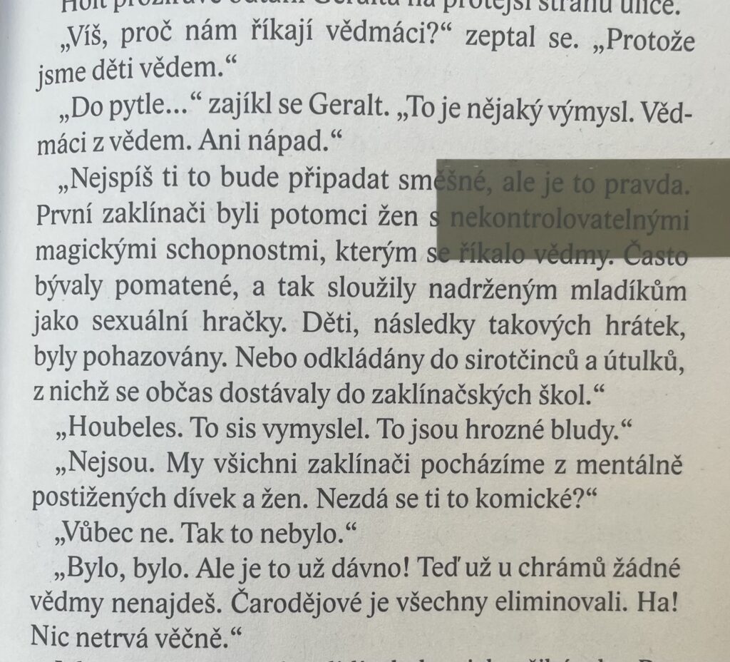 „Protože tenhle mladý zaklínač namísto toho, aby hubil příšery, se neustále sráží s lidmi. Někdy on s nimi, jindy oni s ním… Stejně na tom nesejde.“