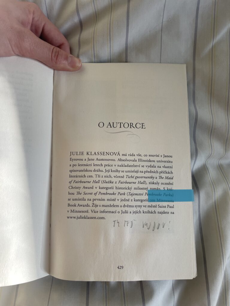 Na rozdíl od ostatních knih z tohoto nakladatelství má Apatykářova dcera o něco více překlepů. Zažila jsem už i lepší překlad. Ani jedna z těchto výtek ale nenarušuje děj. Knížka je překvapivá, nepředvídatelná a velmi dobře propracovaná. Od promyšlenosti milostné dějové linie po historickou přesnost a zajímavosti ze života apatykářů. S klidným srdcem ji s radostí doporučím všem romantickým duším, které by hledaly nefalšovaně romantické čtení, a čtenářkám zmiňované Jane Austenové. Pokud jste snad obojím, pak se Apatykářova dcera od Julie Klassenové výborně trefí do vašeho vkusu. A třeba i do nálady, jako mně.