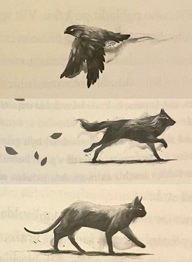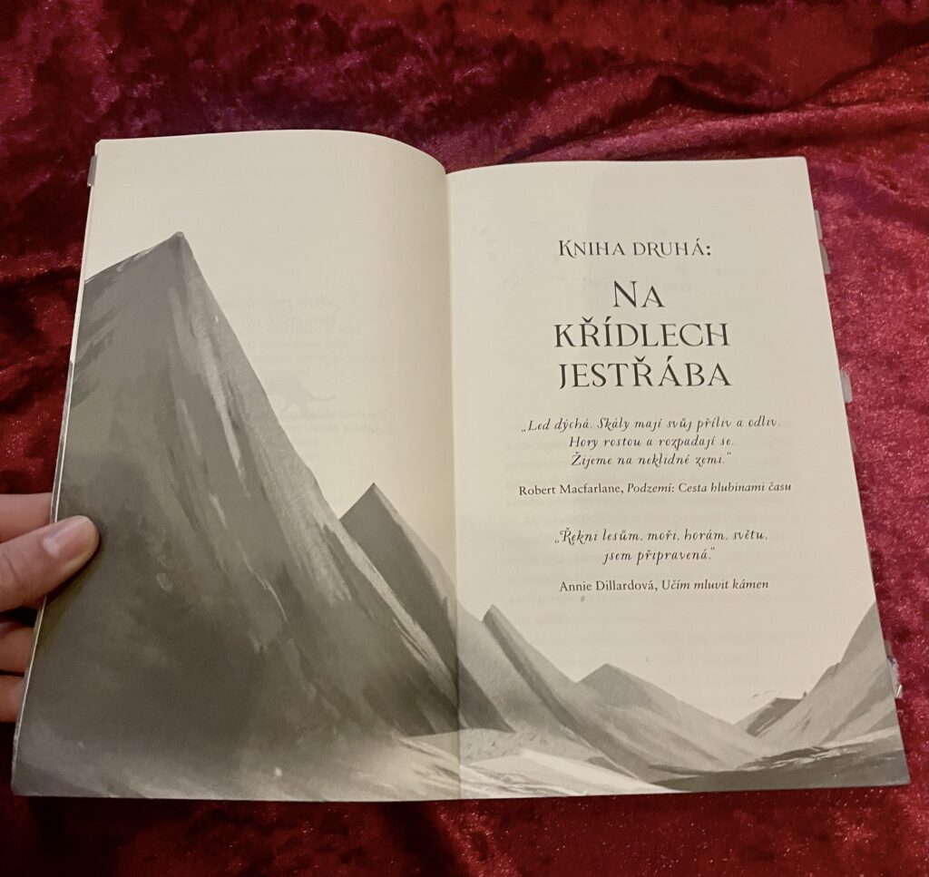 Geomantská trilogie od Kiran Milwood Hargraveové už má venku dva díly. Po Ve stínu Vlčí královny z prosince minulého roku vyšla v listopadu 2025 kniha Na křídlech jestřába. Jelikož jsem Vlčí královnu četla v lednu a Na křídlech jestřába v listopadu, měla jsem pocit, jako by se tím začal minulý rok uzavírat. Tahle série je vymazlená jak z venku, tak zevnitř. Kromě krásné obálky přesahující na barevnou ořízku má název uvedený holografickým písmem, takže při nastavení na světlo se v něm střídají barvy duhy. Je také bohatě ilustrovaná, ilustrace uvádí každou kapitolu. Na celé jedné straně je vždy ilustrace stromu, který se kymácí ve větru, a pod názvem kapitoly je pak obrázek jestřába, vlka nebo kočky. Pro naši hlavní hrdinku jsou to velmi důležitá zvířata a docela mi trvalo, než jsem výběr jednoho ze zvířátek pochopila. Obrázky stromu a zvířat totiž nejsou vybrány jen náhodou. Jak jsem říkala, kniha je vyšperkovaná do posledního detailu a navíc je plná jak lásky ke zvířatům, tak k přírodě.