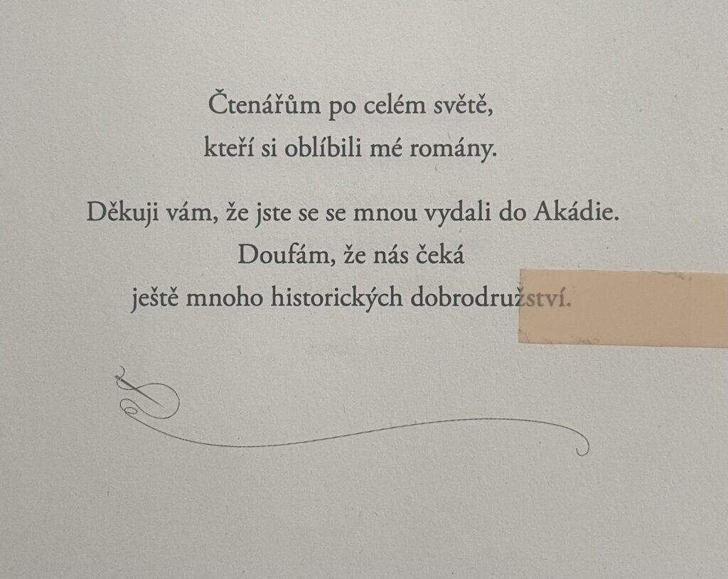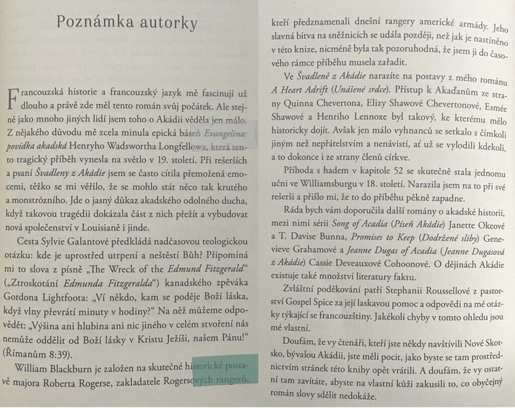 Akádie je velmi tragická kapitola v anglické, francouzské i kanadské historii. Autorka si nebrala servítky a nic nepřikrášlovala. Cokoliv bylo ošklivé a kruté, napsala ošklivě a krutě. Momenty odehrávajících se na lodi při přesídlení Akaďanů jsem četla se žlučí v krku a sevřeným žaludkem, tak nepěkné to bylo. Dobrých sto šedesát stran předtím je věnováno intenzivnímu vykreslení Akádie, takže přestože jsem v ní nestrávila tolik času, vytvořila jsem si k ní pouto. Ostatně stejně jako k hlavním hrdinům hledající naději uprostřed zkázy a zmaru. Byla jsem až v šoku jak drsná autorka byla, protože by mě po Krajkářce vůbec nenapadlo, že je toho schopná.