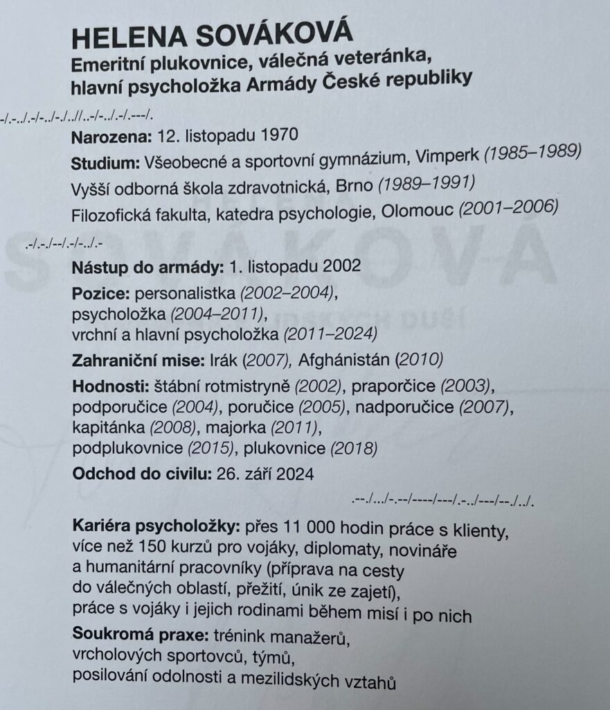 Knížku s Helenou Sovákovou jsem původně číst nechtěla. Nebo chtěla, ale ne ještě v roce 2025. Jenže pak Helena s Martinem Moravcem přijeli k nám do Brandýsa nad Labem na besedu, a tam mě během necelé hodiny a půl přesvědčili – aniž by se o to snažili. Stačilo jim nastínit pár historek zmíněných v knize a průběh společné spolupráce. Helenina lidskost a inteligence byly už během besedy očividné a velmi na mě zapůsobily. Martin byl zase tradičně vtipný. Potěšilo mě, že se projevoval se stejným humorem, jaké znám z jeho sloupečků v Magazínu Mladé fronty DNES. Pravidelně je totiž čtu. Když se spojí kombinace těchto dvou výjimečných osobností, přičemž jedna má za sebou zajímavou a jedinečnou kariérou, vznikne čtení, u kterého se chce čtenáři někdy slzet a jindy se zase upřímně smát. Někdy mu jde po těle husí kůže a na další stránce už ho regulérně mrazí. Tak jsem to třeba měla u kapitol, které vyprávěly o smrti pěti českých vojáků v Afghánistánu. Jejich smrt rodinám oznamovala Helena se svými spolupracovníky brzy ráno, aby se to nedozvěděli od nikoho jiného než od nich. Kromě zajímavých poznatků a historek z praxe kniha obsahuje i spoustu praktických rad pro jednoduchou osobní psychohygienu, které Helena dnes už jen jako běžná psycholožka používá. Tohle čtení tak vede i k zamyšlením nad sebou samým.