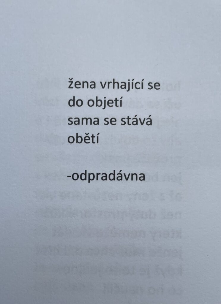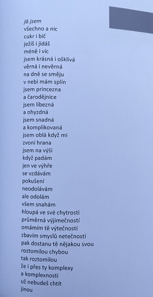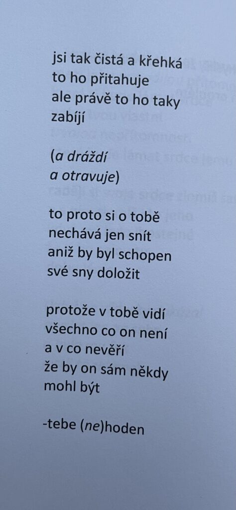 Jsou to básně hravé, dobře mířené a inteligentní. Autorka si hraje jak s jednotlivými tématy a jejich pojetím, tak s volbou slov, řádkováním a kurzivou, kterými dokáže změnit význam slov či i rovnou celé básně. Jsem ještě nadšenější než z Destilace a (Že)nám bych doporučila přečíst každé ženě! Buď si u ní hezky popláčete a poznáte se v ní, nebo vám dokáže otevřít oči. Jedním z témat totiž není jen starání se o náš vzhled či váhu, ale rovnou poruchy příjmu potravy.