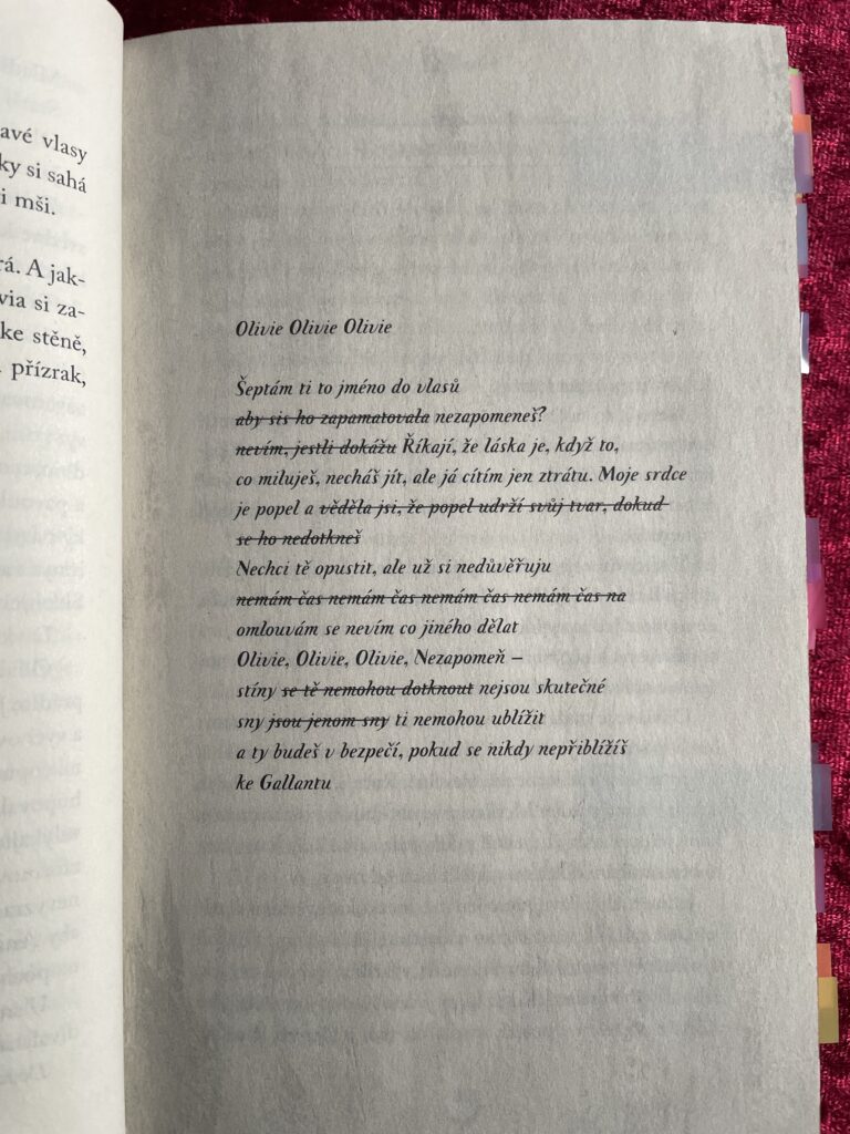 Mnoho částí zápletky do sebe nakonec zapadne jako puzzle. Například proč je Olivia němá. To bylo velké odhalení a mě nadchlo jak promyšlená kniha Gallant je. Ale finální konec? Ten mě lehce zklamal. Vlastně doteď nechápu jak si ho přebrat a co se v něm přesně stalo. Potřebovala bych slyšet více detailů a podrobností, konečně dostat pořádné vysvětlení! A zjistit jak to s Olivií dopadlo. Stejně jako nevíme kdy a kde se příběh odehrává, ani se nikdy nedozvíme jak to bylo dále. Známe Olivii jen teď a tady a už ji vícekrát neuvidíme. Právě tohle mám ale na novelách tak ráda, že nás zavedou do části něčího života, nechají nás chvíli přihlížet a pak popostrčí ať jdeme zase dál. Na první pohled jsem tedy z konce byla zklamaná a rozhozená. Čekala jsem od něj mnohem, mnohem více. Obzvlášť kvůli laťce, kterou si autorka nastavila na začátku a dařila se jí udržet. Nedokážu ale vymyslet co by v onom jiném konci mělo být, nic mě nenapadá, takže bych si možná měla přiznat, že buďto jsem spokojená, nebo jsem hnidopich. Ale víte co? Já tím hnidopichem klidně budu, protože nutkavého pocitu, že něco mělo být jinak a to něco tam i chybí, se nemůžu zbavit.