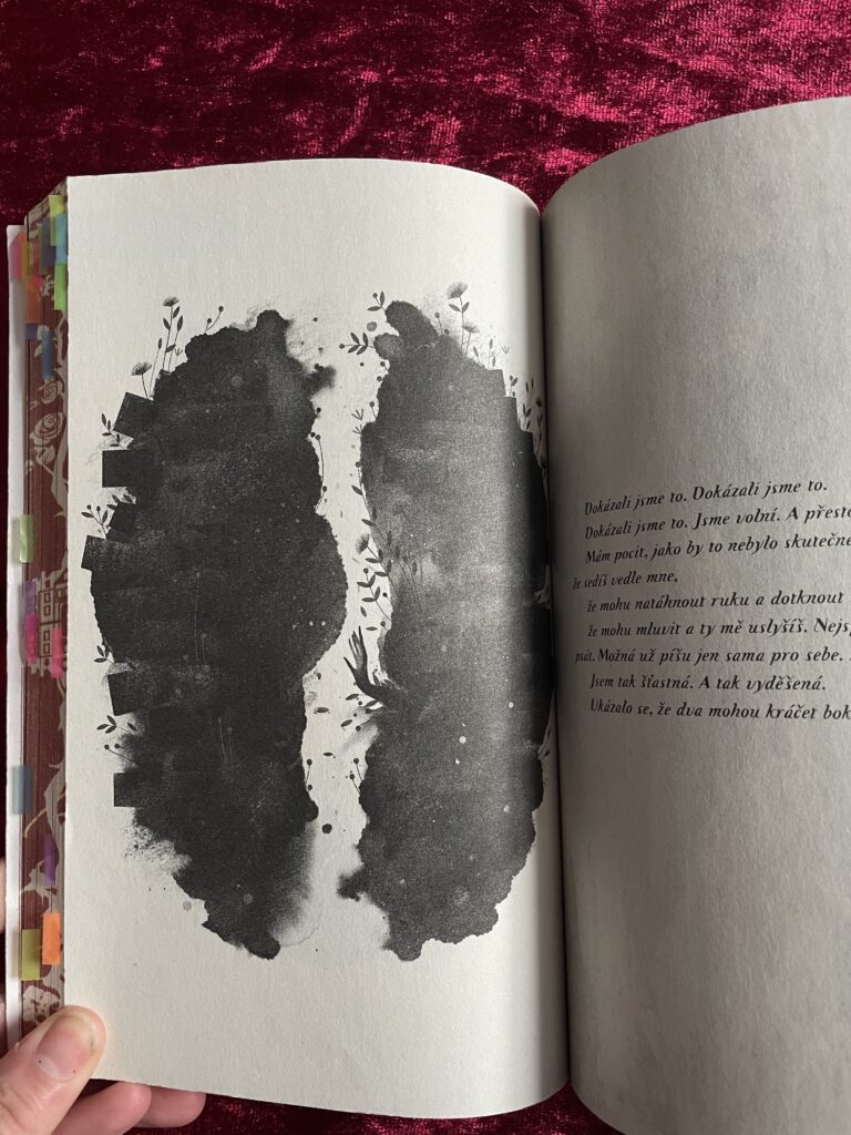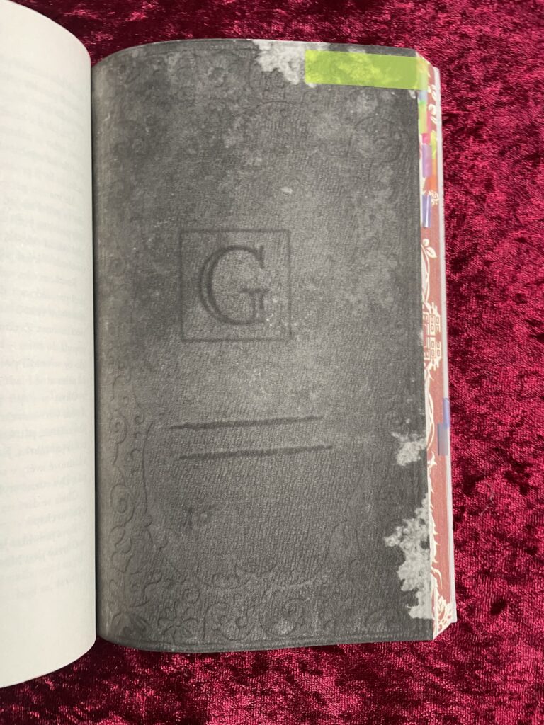 Knihu Gallant zdobí dvě ilustrace sídla na obálce nabízející nápovědu k jedné zápletce z příběhu, má barevnou ořízku, jež zobrazuje vinoucí se trny a opět dva domy. Uvnitř najdeme moc hezké ilustrace a v mém vydání Gallantu se teď navíc skví podpis samotné Victorie Schwabové. Grafické zpracování této knihy je důležité i pro příběh, tak si ho pojďme popsat ještě podrobněji. V knize najdeme několik stránek černé barvy, na kterých je inkoust naopak bílý, je psaný kurzivou a stejně jako celá kniha vyprávěný ze třetí osoby v přítomném čase. Popisuje něco, co zpočátku čtenář nechápe, tudíž nevidí ani význam celého tohoto textu. Ale pochopí a pak ho to bude velmi zajímat. V knize jsou zobrazené i stránky z deníku Oliviiny matky, ať už ilustrace nebo krátké zápisky. A v jednu chvíli je tam přetištěný i celý deník od začátku do konce, přičemž stránka, na níž náhled do deníku začíná, je graficky upravená tak, aby vypadala jako přední desky deníku. Samozřejmě s písmenem G. jako Grace, což je jméno Oliviiny matky, a se dvěma rýhami na deskách, což je přesně to, jak by měl deník podle knižních popisů vypadat. Na konci této vsuvky je pak stránka vypadající zase jako zadní desky. To dělá ze čtení velký zážitek, navíc je to originální a nápadité.