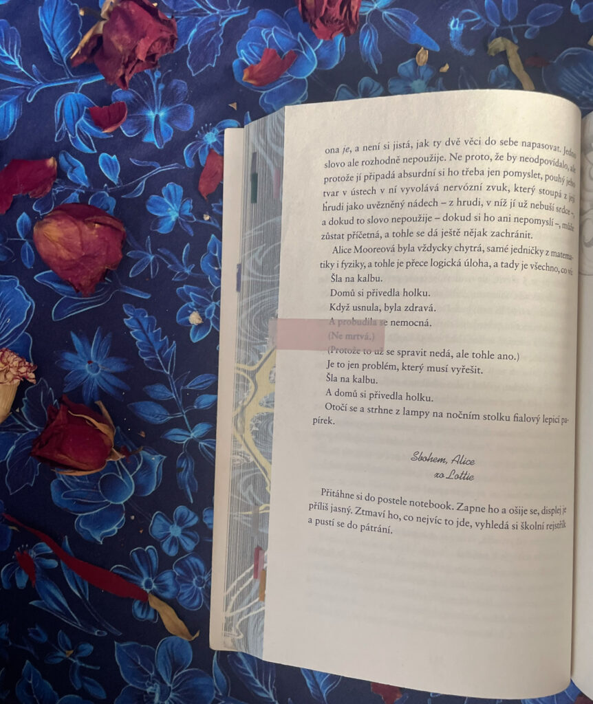 Děj je důležitá věc. Jakkoliv byl ale chytře vymyšlený a originální, komplexnost a psychologie hlavních hrdinek jej zcela zastiňovaly. Je však pravda, že stejně jako spolu souvisí příběhy Alice, Charlotte a Sabine, tak úzce na sobě závisí vývoj jejich osobností a další směr děje. Kdyby se nechovaly jistým způsobem, neovlivnily by je určité okolnosti a samy se nevyvíjely, mohlo být vše jinak. Kniha má šest set dvacet stran a rozhodně jde o pěknou „cihličku“, ale četla se nesmírně snadno a rychle. Jako by hlavní hrdinky byly zpěvačky. Každá sice s jinou barvou hlasu, ale dohromady tvořící nádhernou skladbu. Jakkoliv se zdá, že by vůbec neměly jít dohromady. I v pasážích, o nichž píšu jako o slabších, příběh stále ubíhal svižně a nezasekávala jsem se na nich. Vychvalovala jsem tu i po sobě jdoucí systém jednotlivých kapitol, což zapříčinilo skvěle provázaný finální obrázek. Má to ale jednu nevýhodu – aby měl příběh dynamiku a napětí, Charlottina část přijde až hodně ke konci. Sabine opanuje první třetinu, druhou si mezi sebou dělí Sabine s Alice a třetí patří hlavně Charlotte, případně Charlotte a Alici. Dává to smysl, ale dobrých sto stran do konce bylo její vinou vážně slabých a pro mě i trochu nudných.
